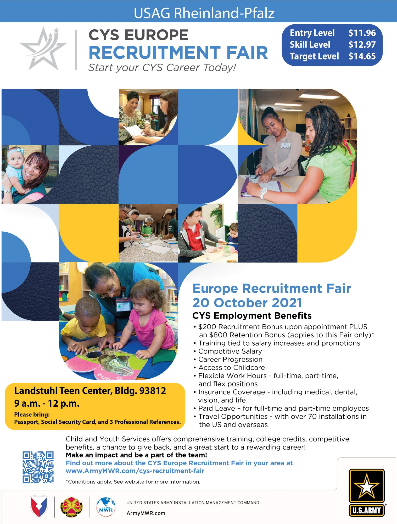 CYS is hosting an in-person Child and Youth Services Recruitment Fair on Oct. 20 from 9 a.m. to noon at the Landstuhl Teen Center, Bldg. 93812 on Landstuhl Post.