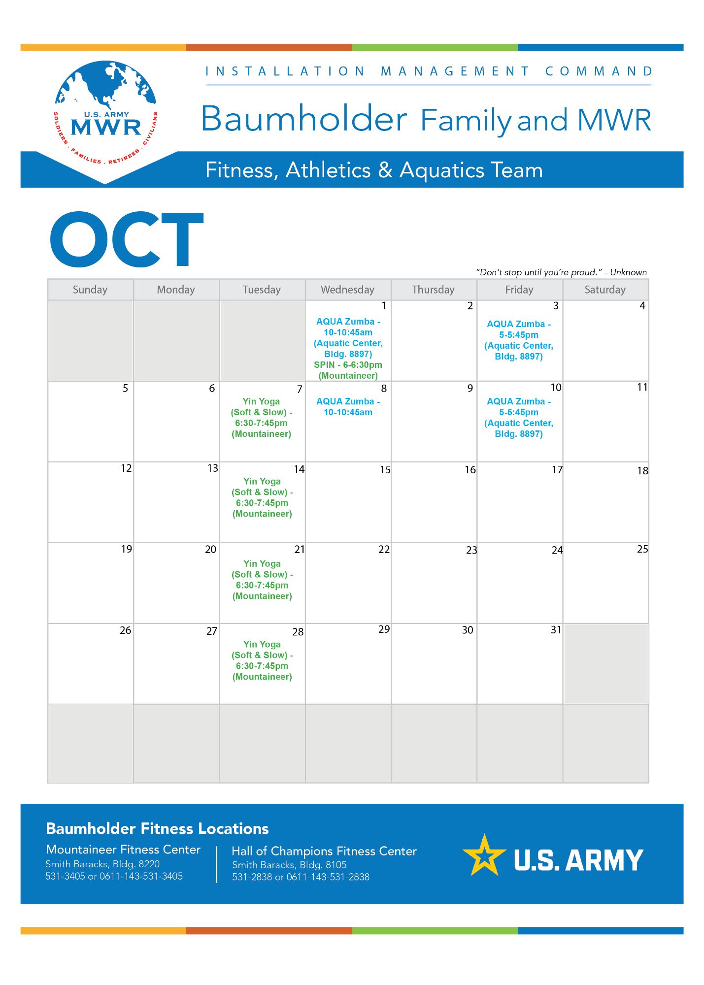 Many find it difficult to reach their fitness goals because they are not adequately educated and motivated. If this is something that you are worried about, you may want to consider talking with our local Family and MWR fitness professionals.