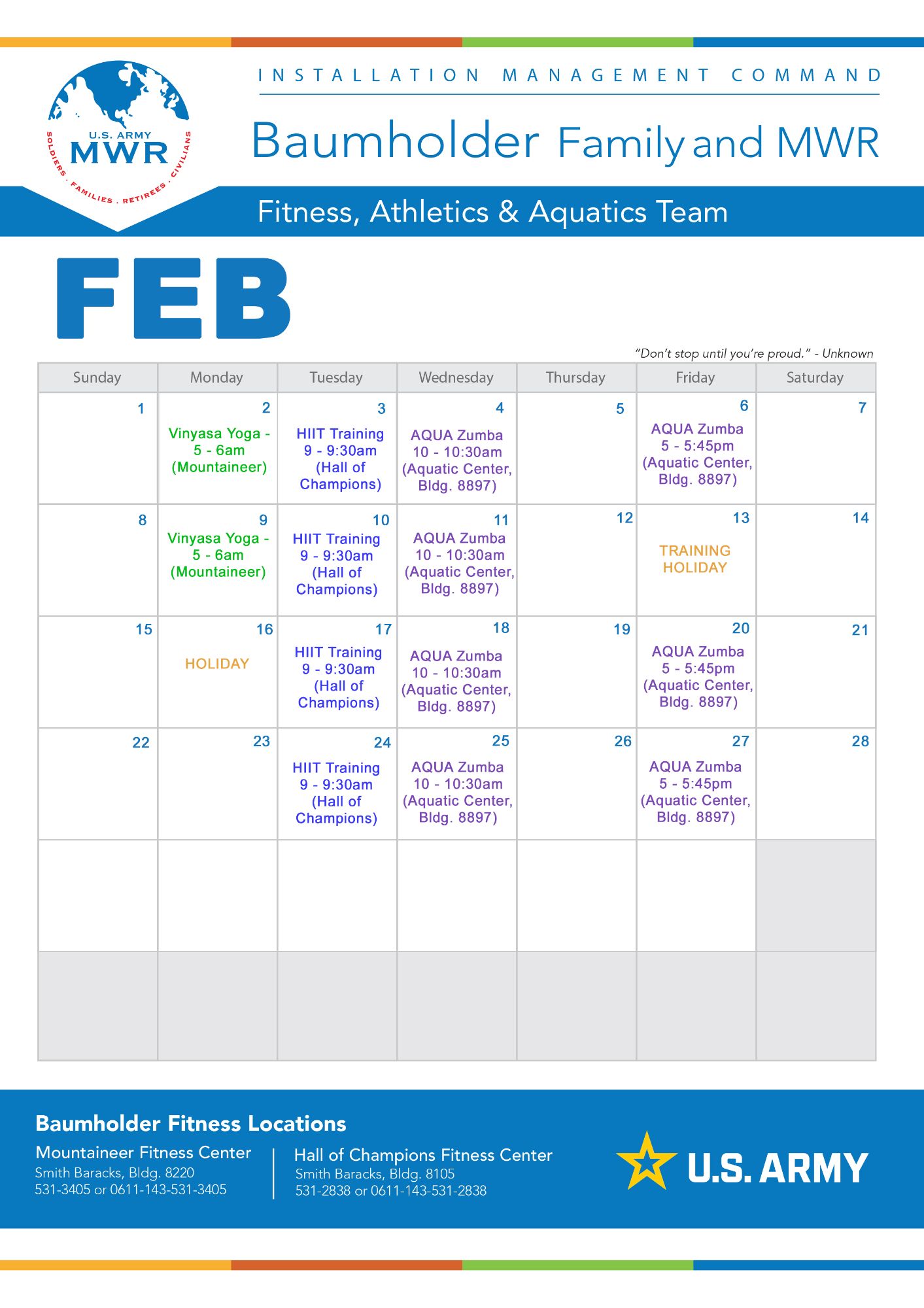 For a complete list of group fitness classes currently available, to include the locations, times, and details, please check out our Sports & Fitness Monthly Calendar.