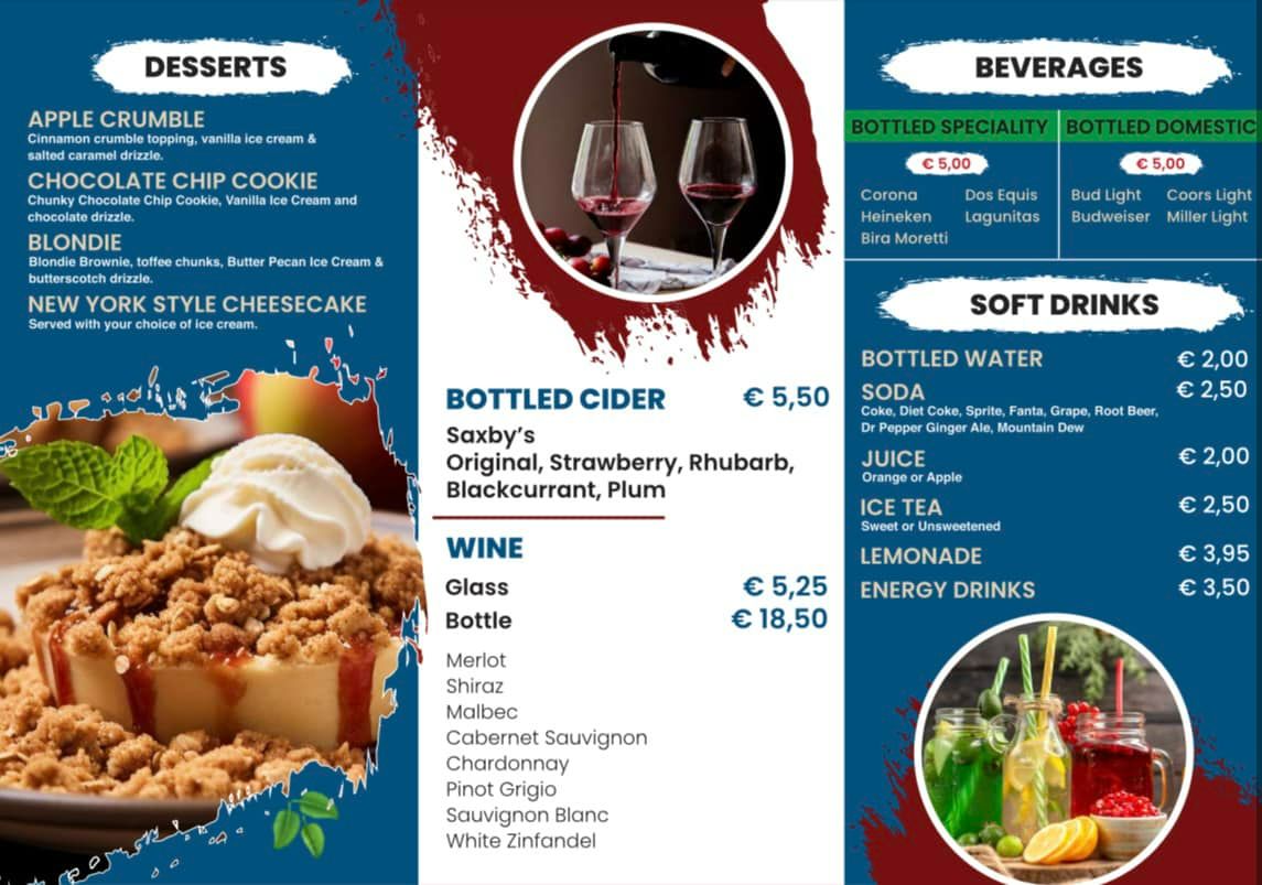- A full-service bar offering various beverage options, to include non-alcoholic beverages, various bottled and draft beers, mixed drink options, etc. (Park Brauerei draft beers offered, such as Lord-Pils, Dunkel Hefeweizen, & the Pirminator)